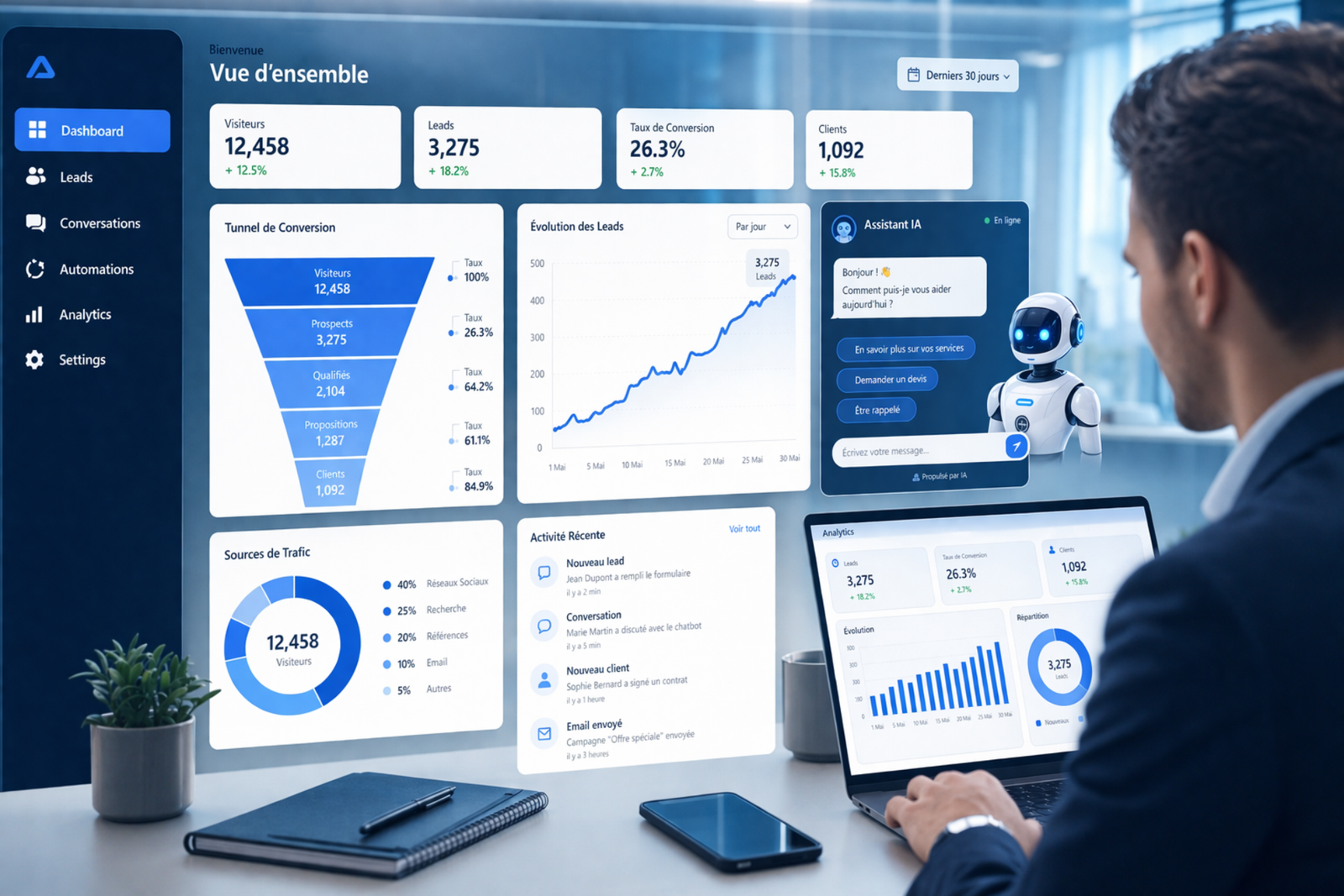 Grâce à l’intégration d’un tunnel de conversion, d’un chatbot intelligent et d’un système de suivi, chaque visiteur est guidé, analysé et converti en opportunité réelle.